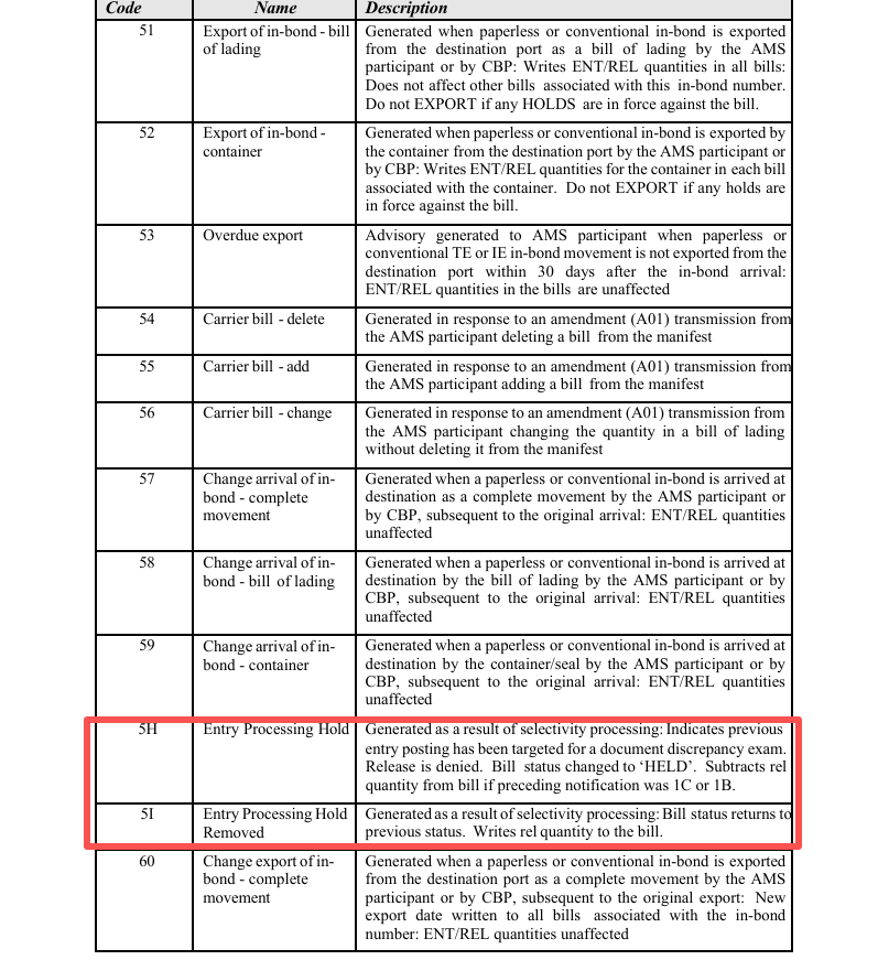 ● 5H(Entry Processing Hold):入境处理扣留。通常表示该票进入了文件差异审查流程,扣留解除前不予放行。